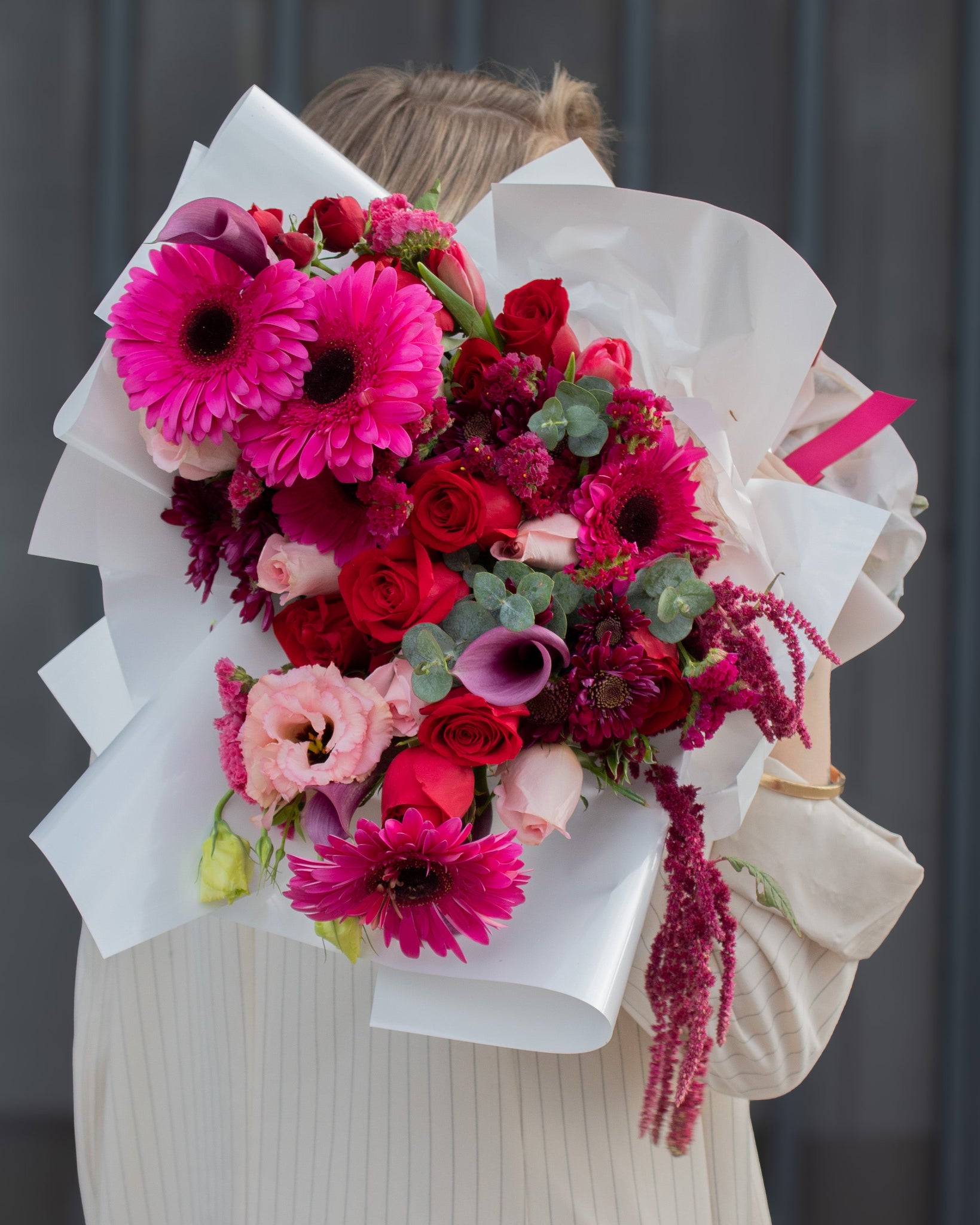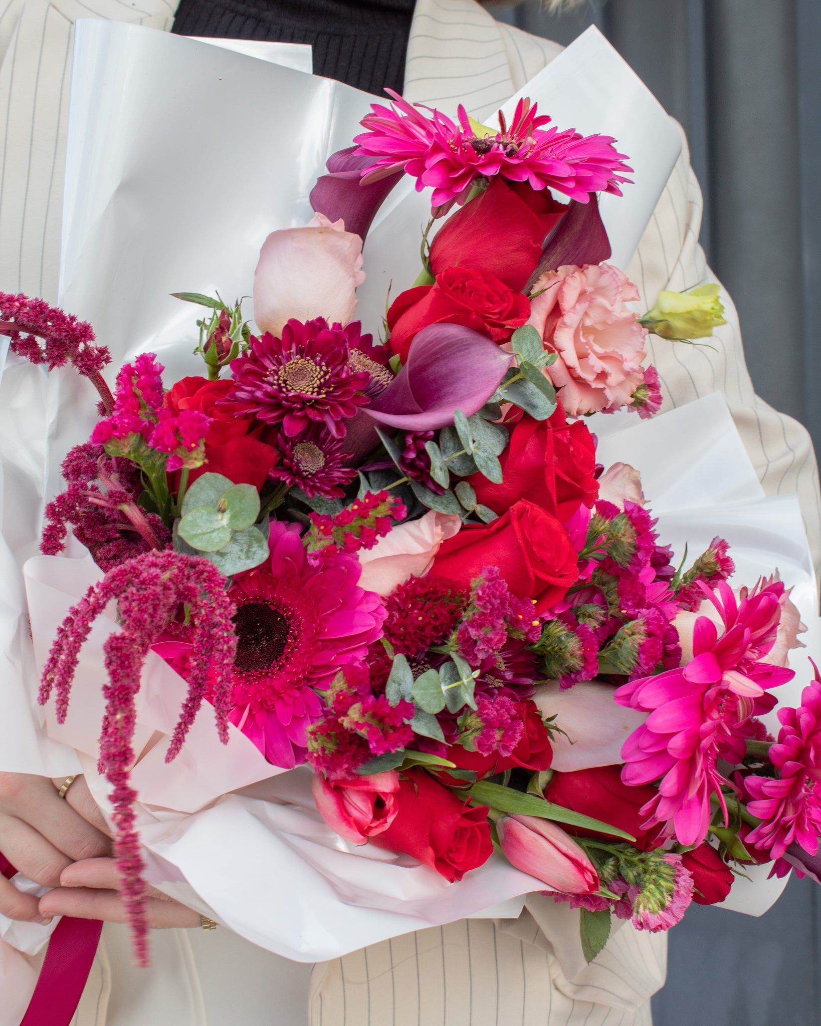 precioso ramo con rosa roja, gerberas, lisianthus y cala lilis.